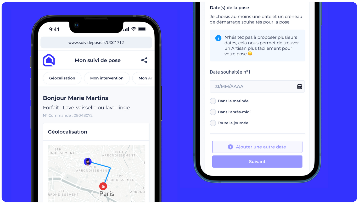 Le Suivi de Pose est un espace en ligne qui vous permet de suivre votre installation en toute sérénité et de communiquer avec l'Artisan si nécessaire. Vous y avez accès dès votre commande !